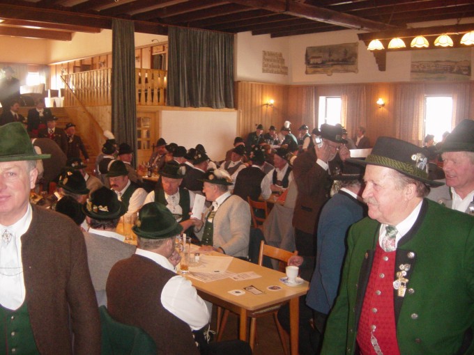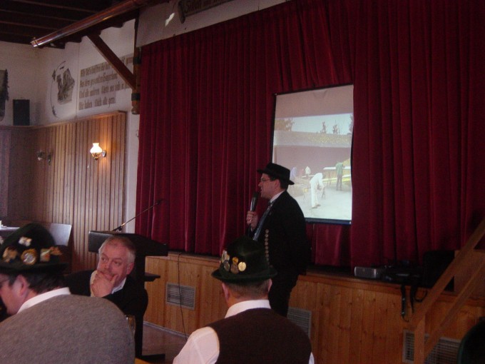 Nach ausgiebiger Besichtigung des Vierseithofes, der bis 1998 eine bewirtschaftete Pfarrökonomie war, traf man sich dann in Hinterskirchen beim Rampl-Wirt zum Mittagessen. Anderl Huber, stellvertretender Vorsitzender des Fördervereins vom Haus der Bayerischen Trachtengeschichte, nutzte die Zeit mit einem beeindruckenden Vortrag über dieses Projekt, die Vorstände davon zu überzeugen, daß dieses Projekt von immenser Wichtigkeit ist für die Zukunft der bayerischen Trachtenkultur.