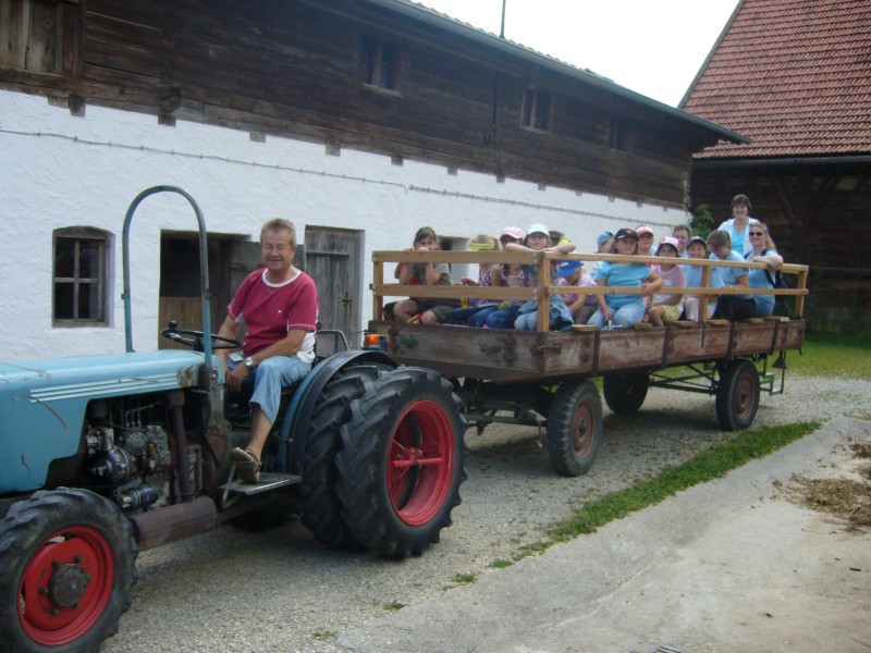 Ein alter Schmalspurtraktor mit Spezialanhänger fuhr uns durch die Museumslandschaft von Hof zu Hof und Frau Klingshirn erklärte uns das Leben der Kinder, sowie eines Bauern und einer Bäuerin auf den verschiedenen Höfen.