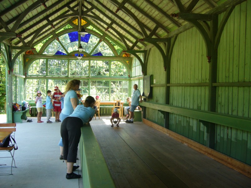 Ein weiteres historisches Gebäude ist die Kegelbahn. Sie wurde in Egglkofen abgebaut und steht jetzt im Bauernhofmuseum in Massing. Sie wurde von unseren Drindl und Buam ausprobiert. Mit alten Holzkugeln, Holzkegeln und natürlich dem Holzboden war es gar nicht so einfach einen guten „Schub“ zu machen. Die Holzkugeln mussten von Hand wieder in die Kugelbahn gehoben werden und die Holzkegel wurden von den Kindern selber aufgestellt.
