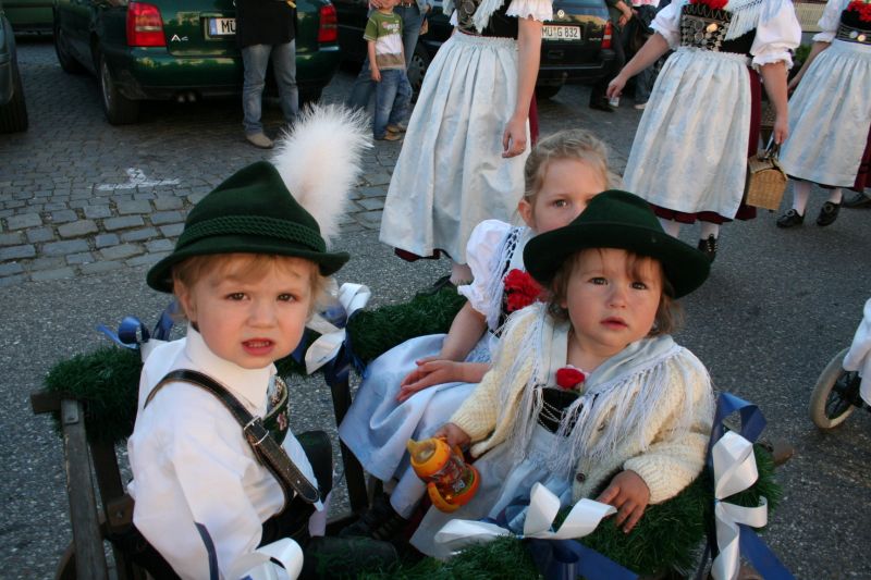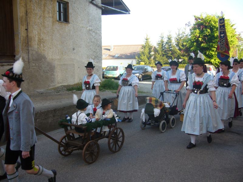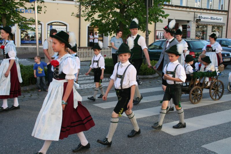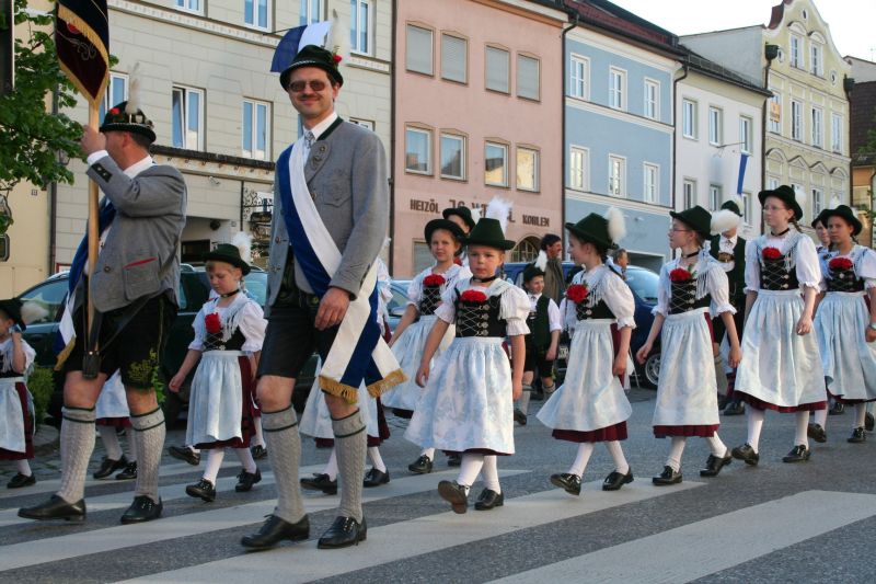 23 Kinder und Jugendliche und 15 Erwachsene beteiligten sich mit ihrer Festtracht am Volksfestauszug. Bei schönem Wetter wurde mit Vereinsfahne, Fahnenbegleitung und Leiterwagerl durch den Stadtplatz zum Volksfestplatz marschiert.