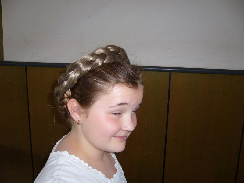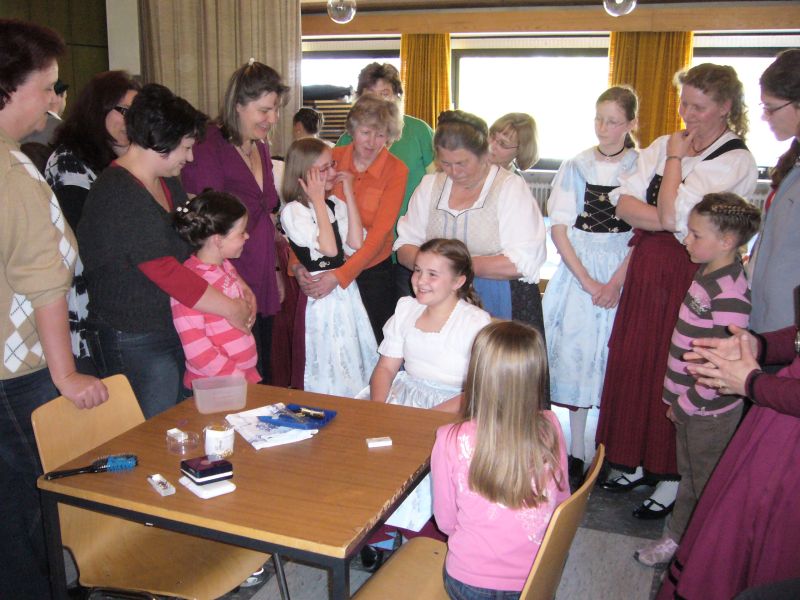 Die Mütter durften alle an ihren Dirndln üben und erhielten wichtige Tipps und Ratschläge, wie man mit den verschiedenen Haaren und Haarschnitten eine passende Frisur flechten kann. Erst als alle Drindl eine schön geflochtene Frisur hatten, gab sich Rosmarie zufrieden und dankte für das große Interesse der Beteiligten.