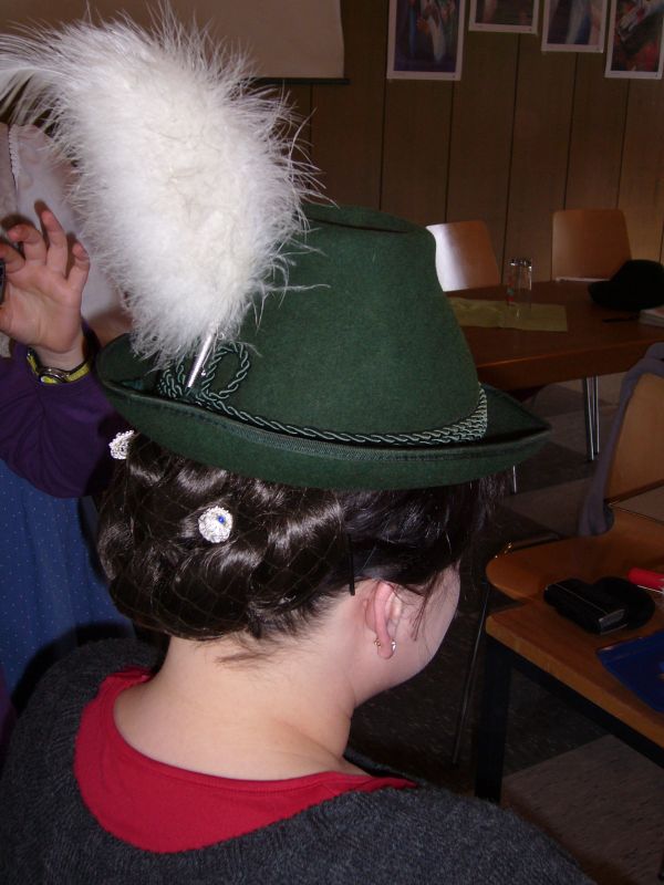 Anschließend zeigte Rosmarie Henke an den Drindl verschiedene Frisuren. Je nach Festlichkeit, Alter der Drindl und Art des Gewandes trägt man eine Zopf-, Hut-, oder Gretlfrisur.