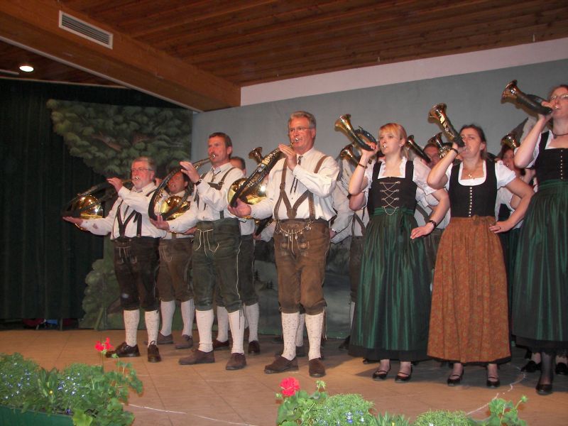 Großartig waren die Darbietungen der Gastgruppe - das Jagdhornbläser-Korps aus Eggenfelden. 21 Dirndl und Buam bliesen ins Horn und brachten so die Zuschauer zum Staunen. Der Männergesang der Jagdhornbläser mit Akkordeonbegleitung gefiel durch ihre schönen lustigen Lieder.