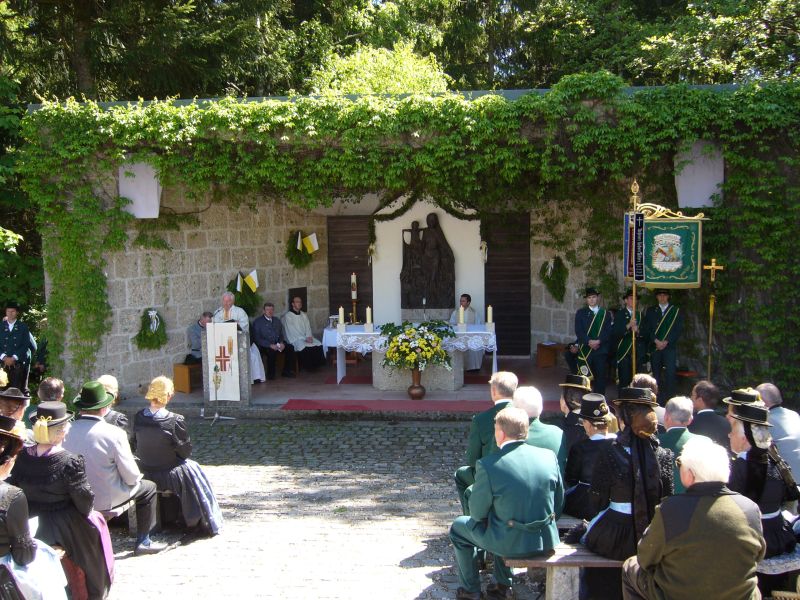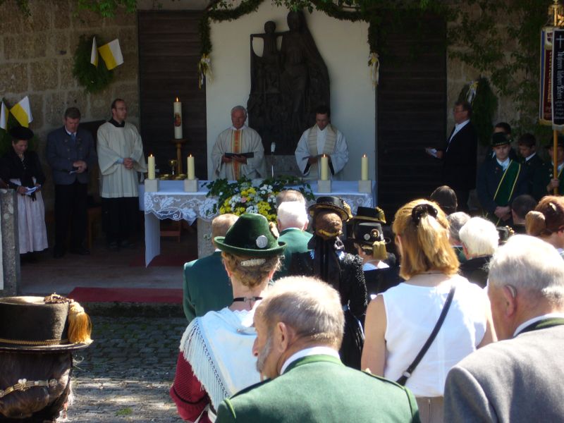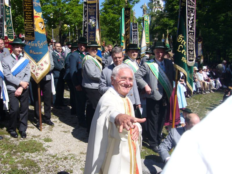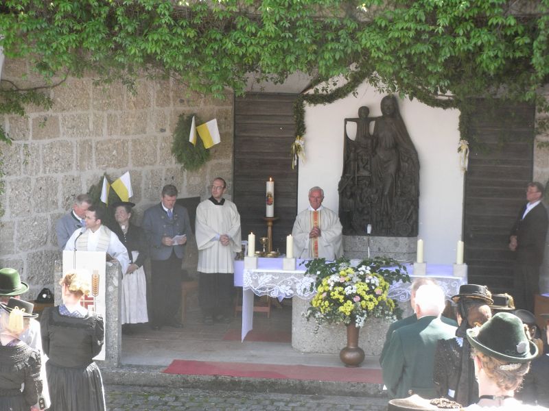 Gauvorstand Peter Eicher freute sich über die Teilnahme von Otto Dufter, dem Landesvorsitzenden des Bayerischen Trachtenverbandes ebenso herzlich wie über die Abordnungen aus dem Chiemgau Alpenverband und dem Inngau und begrüßte besonders die Patres des Klosters und die vielen Bürgermeister, die mit ihren Vereinen betend den Berg heraufgezogen waren. Eicher erinnerte an „Dank und Bitt“, die Gründungsgedanken der Wallfahrt vor fast 60 Jahren, die auch heute noch, angesichts Deutscher Soldaten im Auslandsdienst, bittere Realität darstellen. „Werden wir nicht müde im Beten um ein friedliches Miteinander in der Welt“ mahnte der Gauvorstand und gratulierte dem Zelebranten der Messe, Ruhestands-Pfarrer Alois Holzner aus Kirchanschöring im Namen aller Trachtler zum 72. Geburtstag.