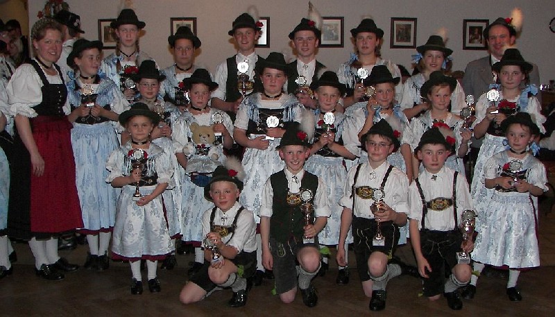 Stolz wurde auch dieser Pokal von den 8 Kindern entgegengenommen. Als besondere Einlage gab es kurz vor der Siegerehrung der Kinder und Jugend einen Auftritt eines Paares der Gaugruppe, welche eindrucksvoll den Walzer mit Plattler und hinterher das Einfangen des Dirndls zeigten.