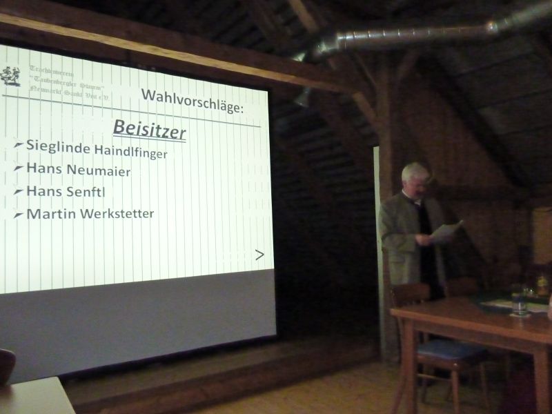 Die durchgeführten Neuwahlen führten zu folgendem stets einstimmigen Ergebnissen. Erster Vorstand bleibt Klaus Eckereder, zweiter Vorstand Richard Wimmer. Auch die beiden Kassiere Werner Frenzel und Hans Lengfellner behalten ihre Posten. Wolfgang Eckereder löst Martin Werkstetter als Schriftführer ab, der dessen Posten als Ausschussmitglied übernimmt. Jugendleiterin bleibt Birgit Frenzel ebenso wie Andy Haindlfinger Vorplattler. Andrea als Vortänzerin, Hermann Jost als Fähnrich, Resi Kupper als Trachtwartin, Renate Geltinger als Theaterspielleiterin, Hans Deinböck als Vereinsmusiker, Hans Lengfellner als Reiseleiter, und Gabi Deinböck für die Stubenmusik wurden alle in ihren Ämtern bestätigt. Als Beisitzer fungieren Sieglinde Haindlfinger, Hans Neumeier, Hans Senftl und Martin Werkstetter. Die Kasse wird weiterhin von Sepp Mitterhofer und Sepp Rauscheder geprüft.